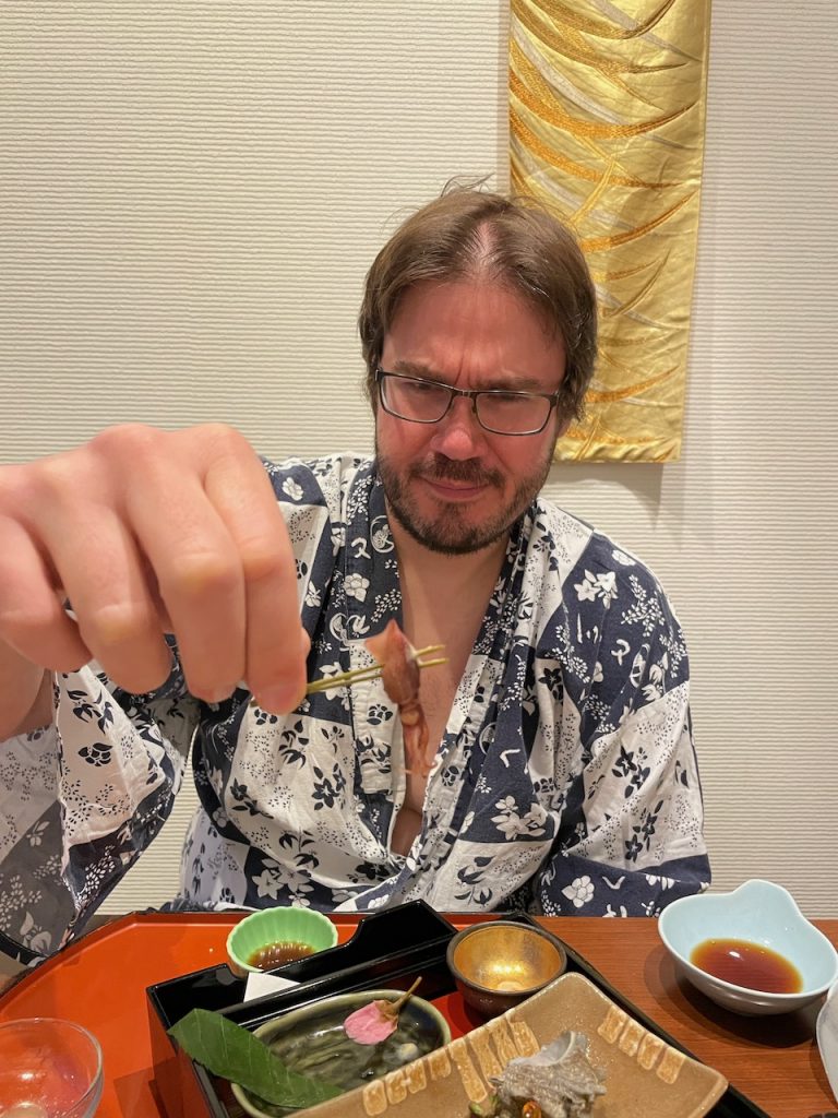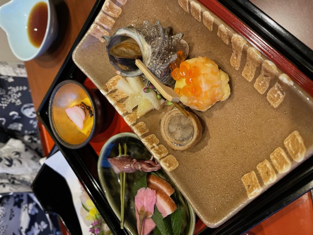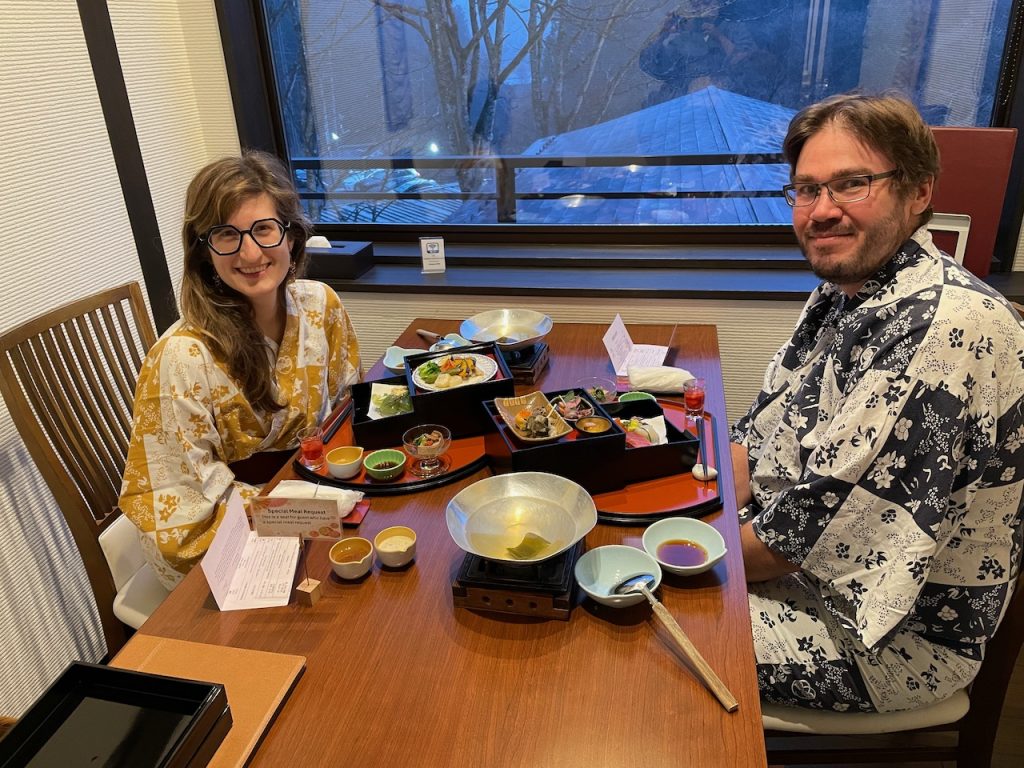In Nikko, we are doing something I have always wanted to do: staying at a traditional onsen ryokan (hot spring hotel), and having kaiseki (a traditional course meal). This particular stay is brought to you by the combination of the yen being incredibly weak and my airfare being a rewards ticket and thus, costing me nothing but fake airline currency built up as credit card spending during the pandemic.