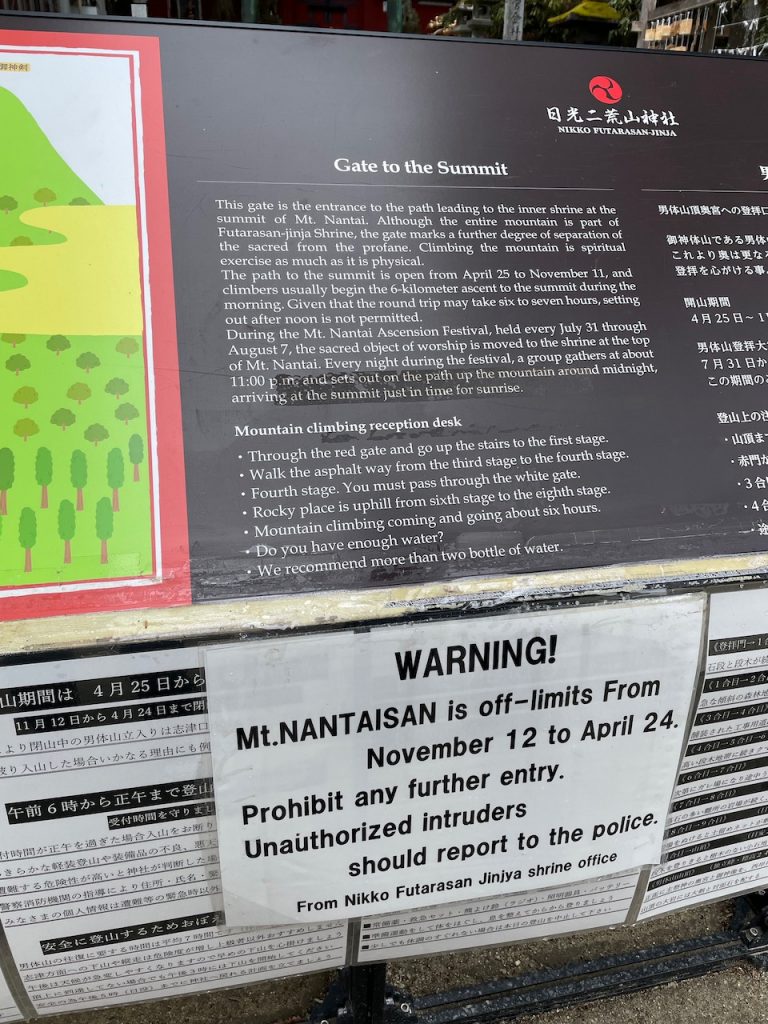 We stopped midway back at one of the shrines – Futarasan-jinja, named after the sacred mountain behind the shrine that you can ascend. The path doesn’t open until April 24th so it’s a ghost town. I cannot fathom the ascent to the top, which goes up thousands of meters to the summit. It’s said to be a spiritual experience, which I assume is just code for “you will die doing this.”