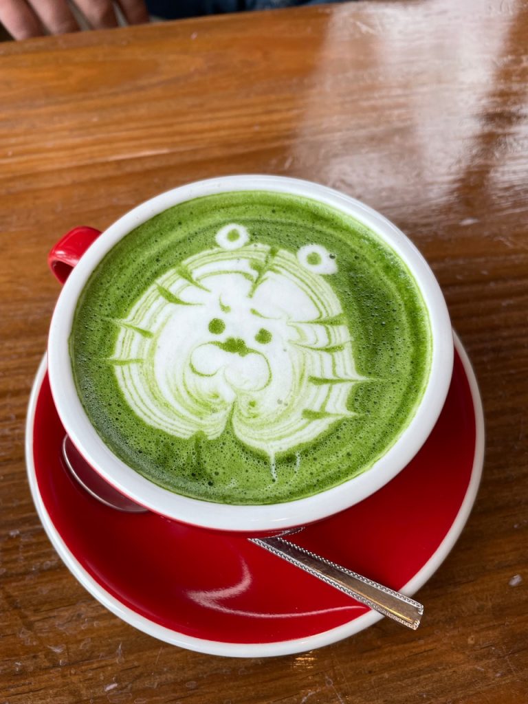 We get some coffees afterwards and Rhett’s matcha latte has some next level tiger art in it.