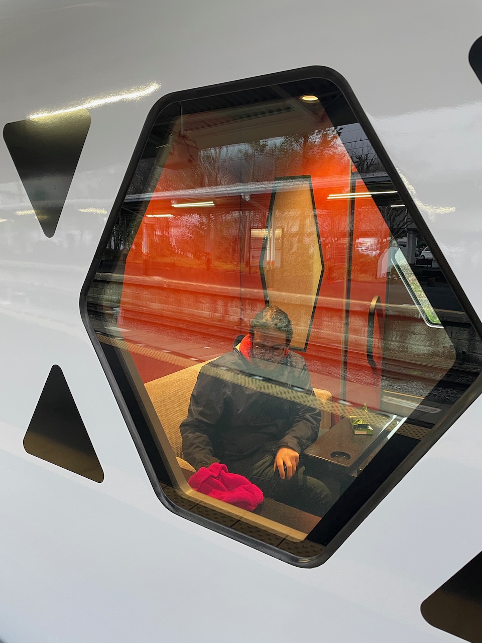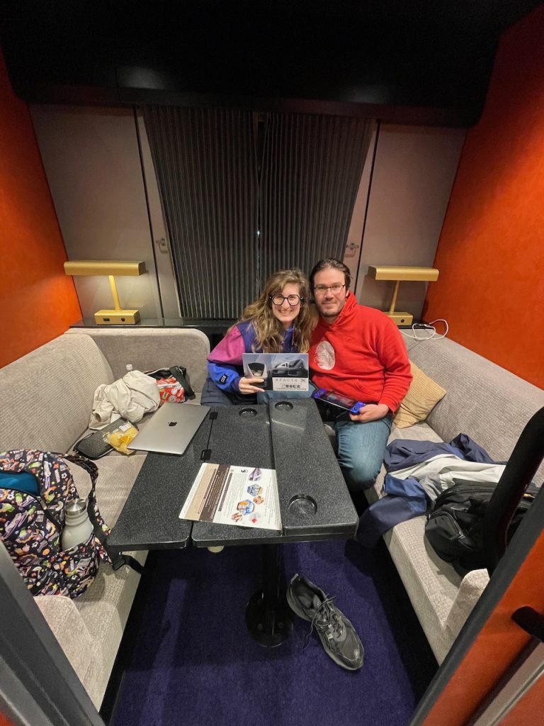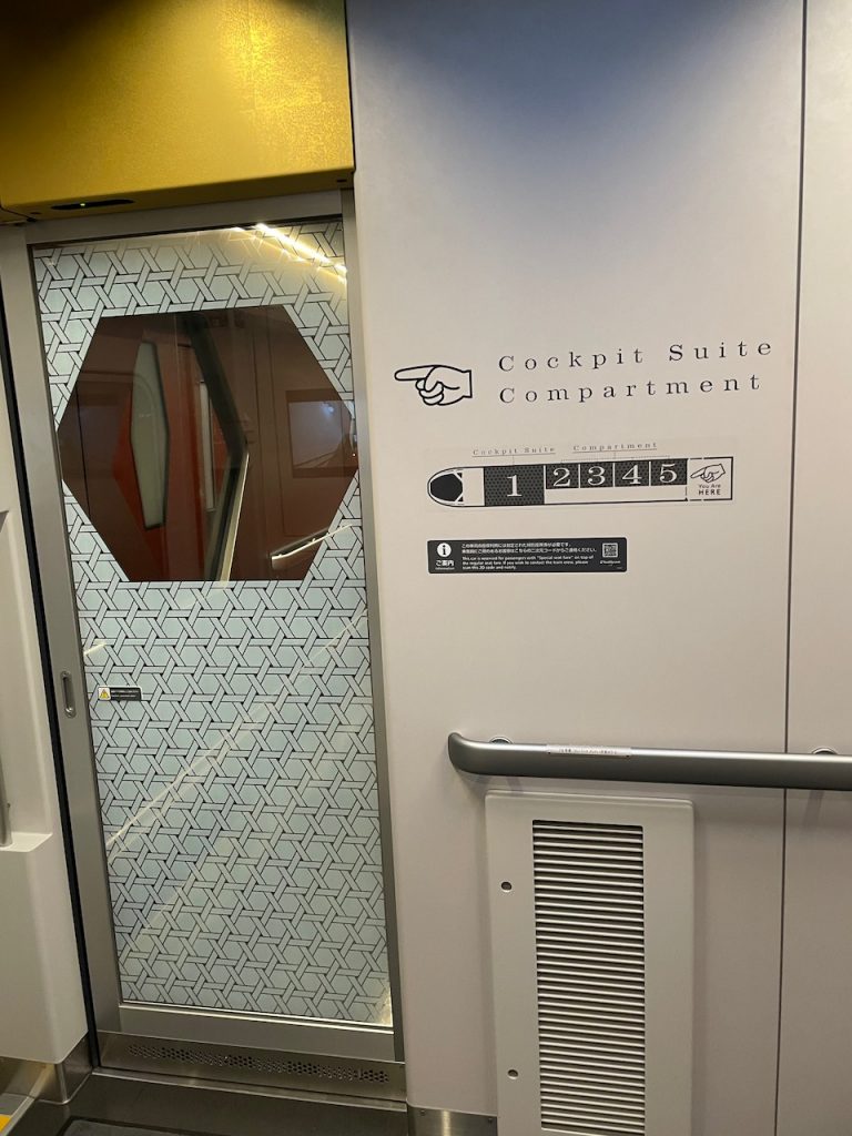 When we leave Nikko, it is the very last fancy train of the trip: the newly-released Spacia X train, which runs from Nikko to the east side of Tokyo. I booked a compartment for the two of us, and it’s also got a cockpit lounge, a bar car, and some other fancy seats. It’s a really special experience, with a lot of extra customer service around the bar car, pictures, and boarding.