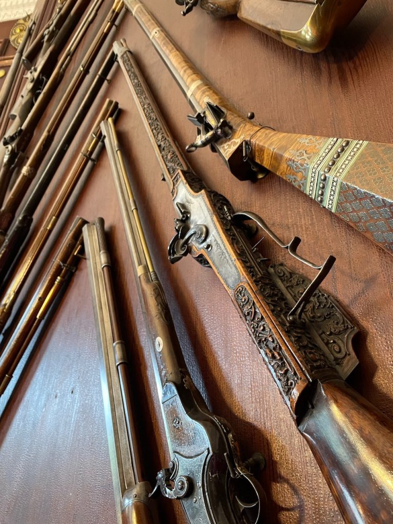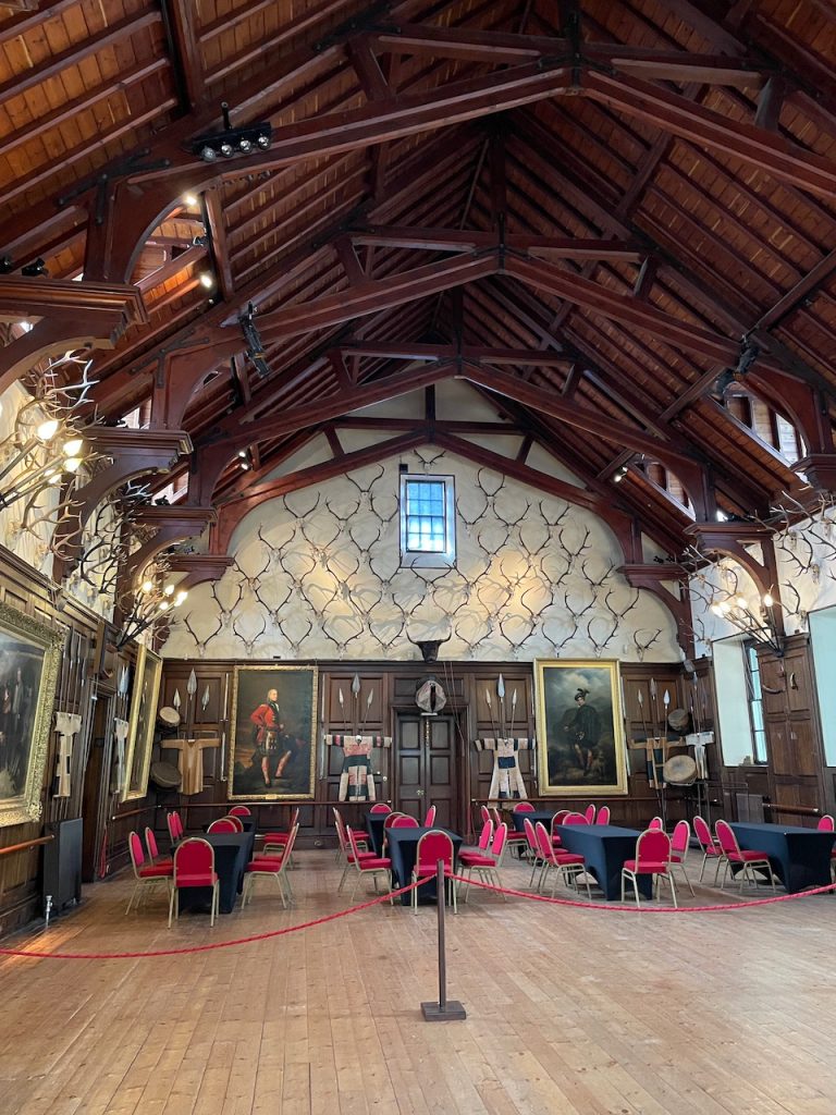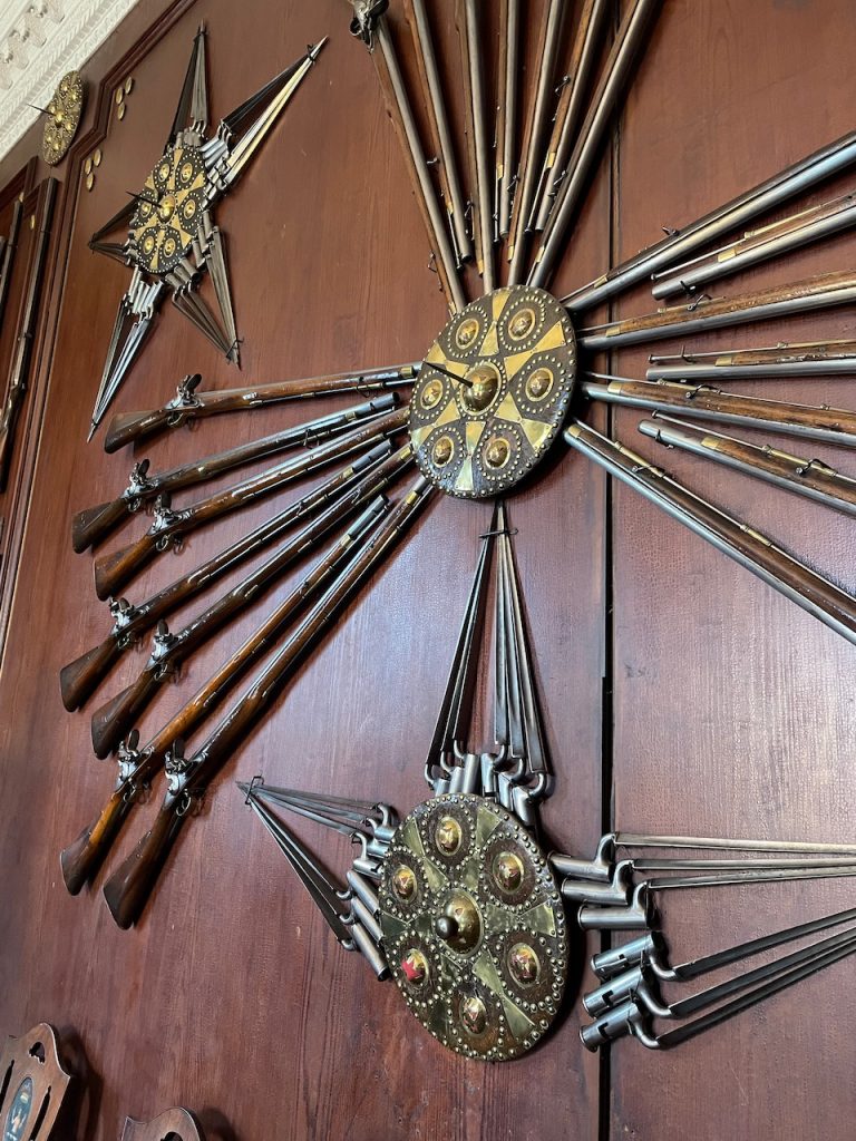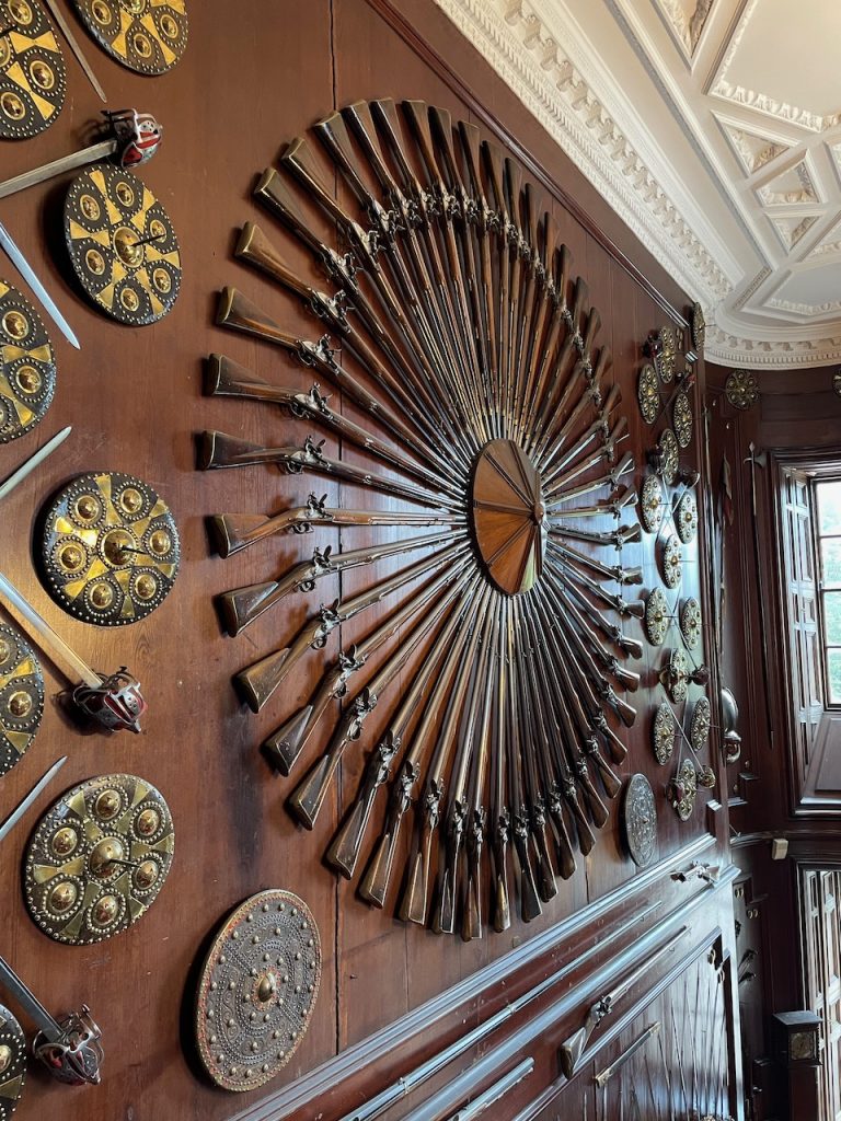 One of the things I deeply appreciate about the castle decor in this region of the highlands is the fact that they have loads of swords arranged in stabby little circles around shields. Blair Castle greets you with so many mounted stabbing and shooting implements in the entry hall, which all had a varying degree of fanciness carved into them.