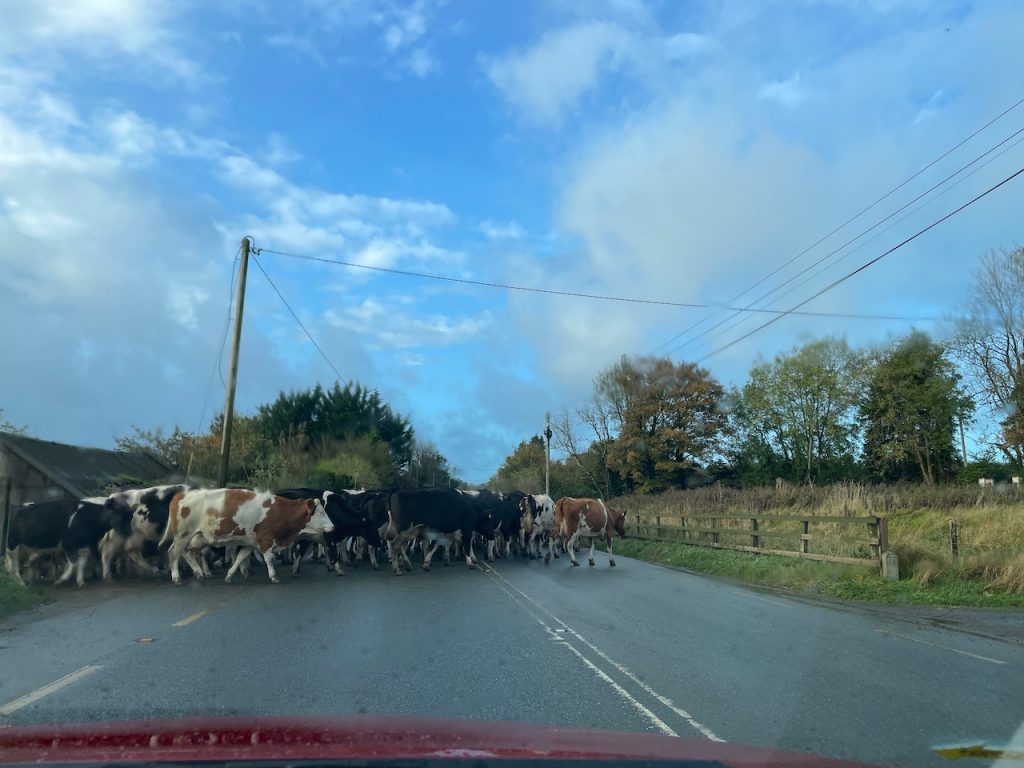 This is our most action-y Irish day: we have three timed stops. Our first is about 45 minutes away, and we build in extra time because I drive like a grandma and I don’t want to put Red Car into a hedge or into another car. Good thing we did, because about ten minutes into our journey, we encounter cows in the road being herded by a few farmers and a sheepdog!