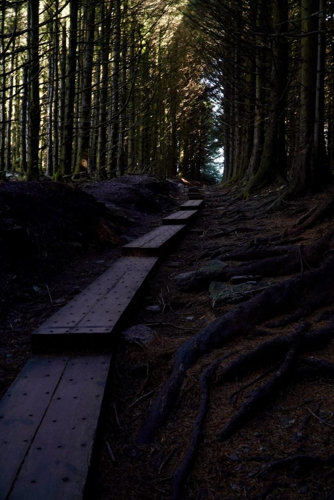 We try to get on the trail right by the car, but it looks like we’re going to be stolen by witches or something because it is dark and spooky and the pines absorb every little noise, and there is also no map. We nope on out of there and go up the hill to where we saw the biggest sign and the most people. Boardwalk, where are you?