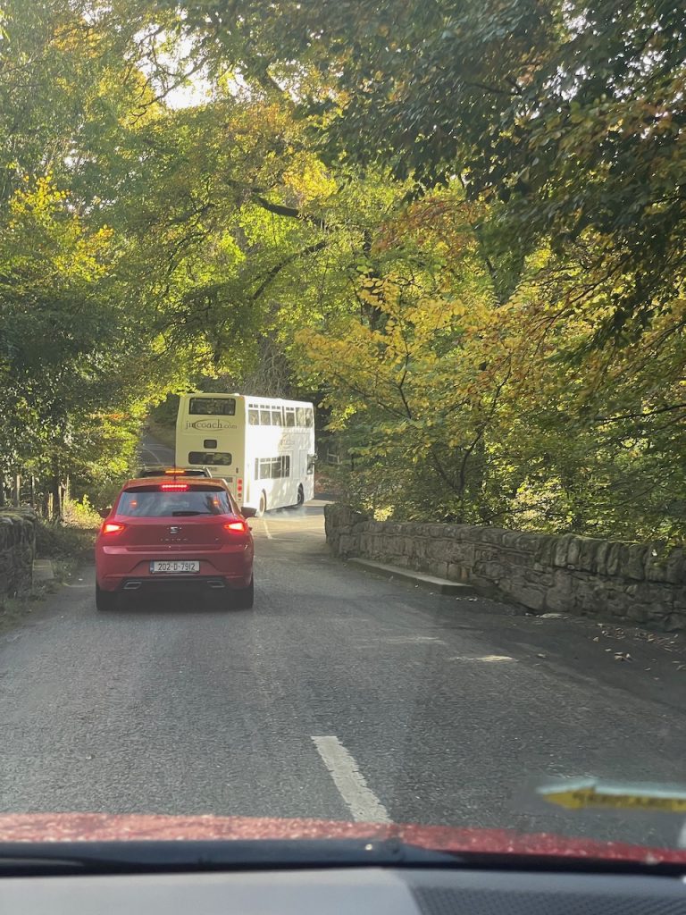 To get there, we have to drive through the Wicklow mountains, which are beautiful, ancient, and rolling. Sheep are literally in the road, but not as aggressively as Iceland, where you always have three sheep (aka threep) chilling in the road, usually a mom and two babies. We just had to contend with the occasional sheep butt in the relatively narrow road. For a while, we had a bus escort. It was great because it barely fit on the street and we assumed it would just ram all oncoming traffic.