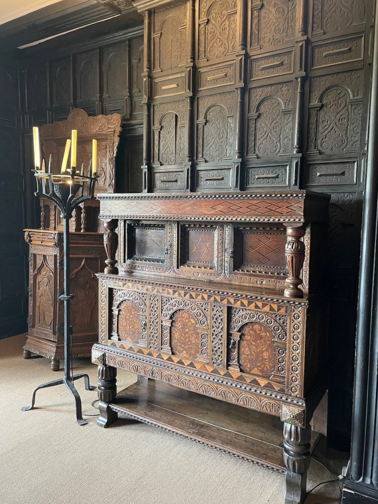My favorite is the medieval dining hall, complete with a minstrel gallery and a haunted door up to the gallery, which is haunted by Puck, a minstrel who died of a broken heart. The castle is Very Haunted, with locals reporting sightings, and the staff coming into the castle every morning needing to straighten many paintings.