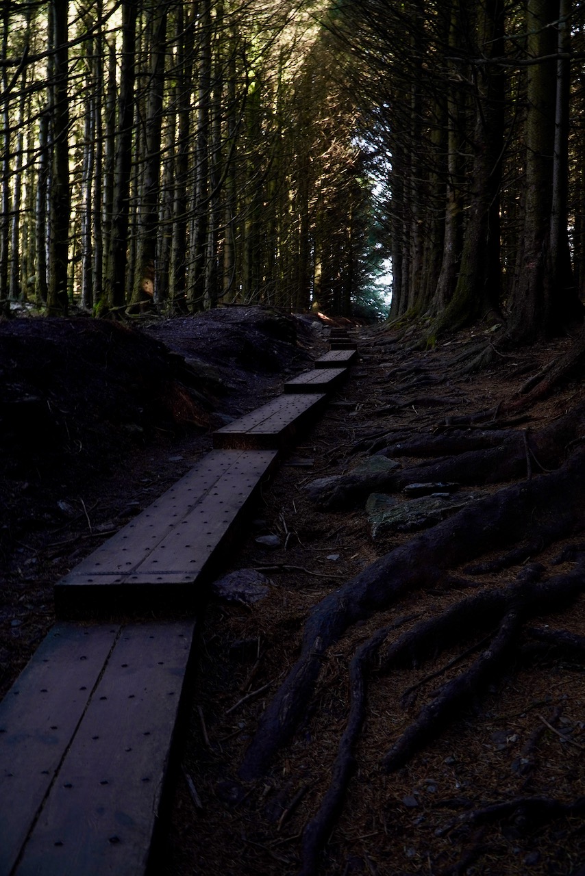 We try to get on the trail right by the car, but it looks like we’re going to be stolen by witches or something because it is dark and spooky and the pines absorb every little noise, and there is also no map. We nope on out of there and go up the hill to where we saw the biggest sign and the most people. Boardwalk, where are you?