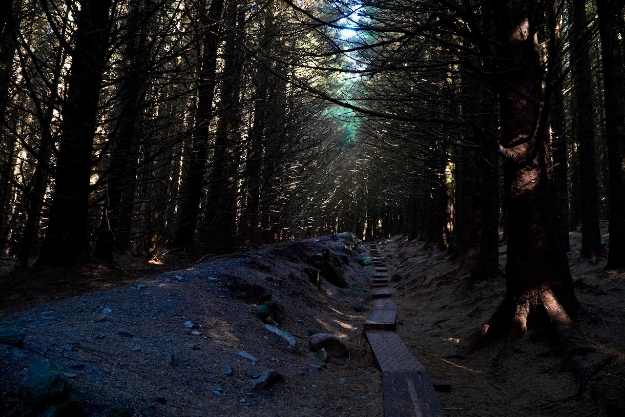 After checking out the overlook, we descend into some pine forest, much younger than what we had seen near our car. Lo and behold, a boardwalk appears! The pines eventually tower over you and sunlight can barely filter through, except in a few places. This part feels much more magical, especially now that we know where we are going. If you wandered off the path, I’m not sure anyone would find you again.
