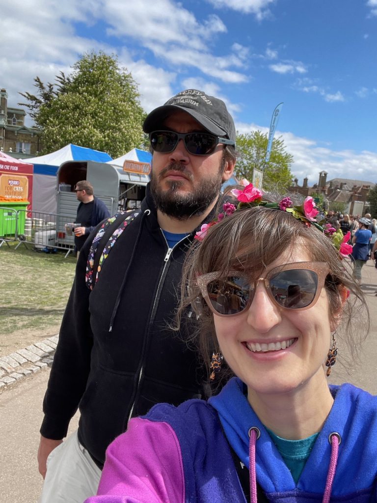 More importantly, in this carnival cacophony of rides, food, and shops, I find what my heart had been set upon since yesterday: a small flower crown. They are probably for children but also are only £4 so I get one. It’s pink (duh).