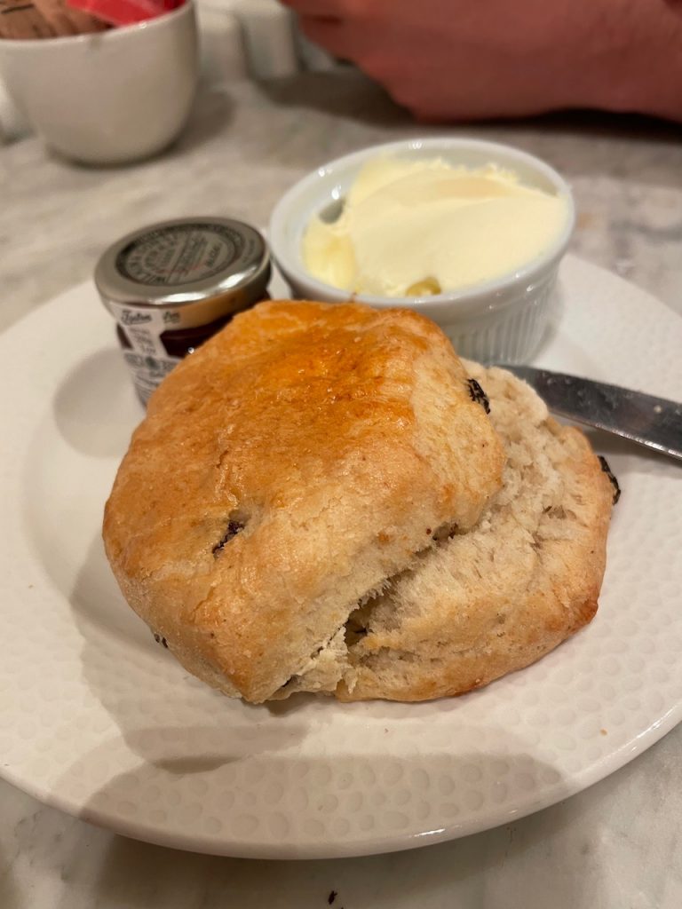 Monday morning is a slow departure, and I finally got my first scone! Yeah! A fruit scone, which is code for RAISINS. I happen to like raisins (sultanas), so we’re happy. My scone is nice and warm and my god there’s so much clotted cream. I think I actually ordered cream with a side of scone.